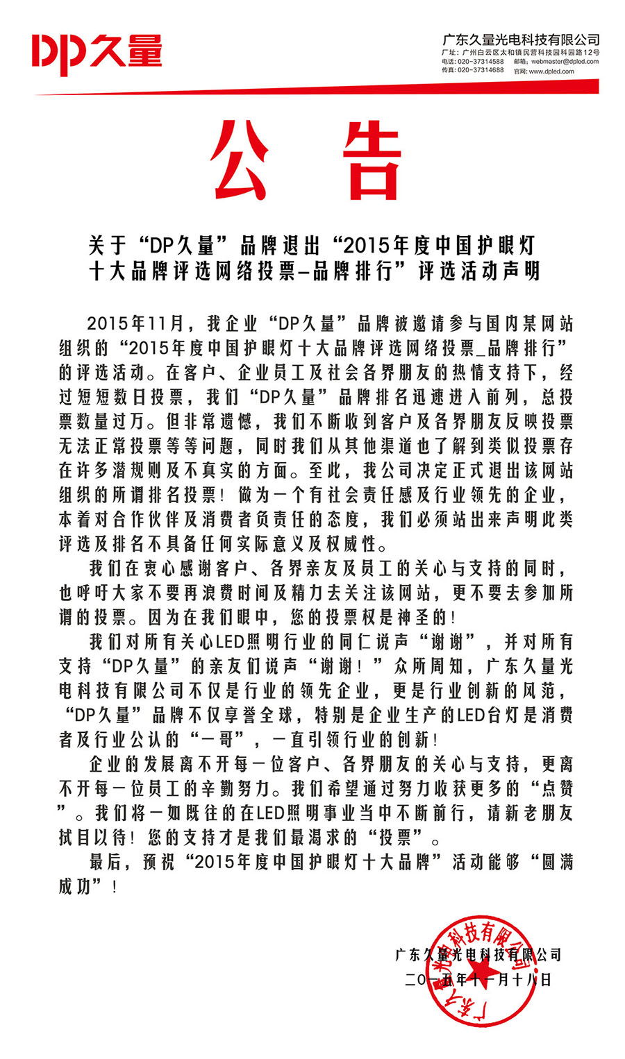 2015年11月,我企業(yè)“DP久量”品牌被邀請(qǐng)參與國(guó)內(nèi)某網(wǎng)站組織的“2015年度中國(guó)護(hù)眼燈十大品牌評(píng)選網(wǎng)絡(luò)投票_品牌排行”的評(píng)選活動(dòng)。