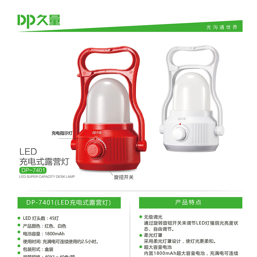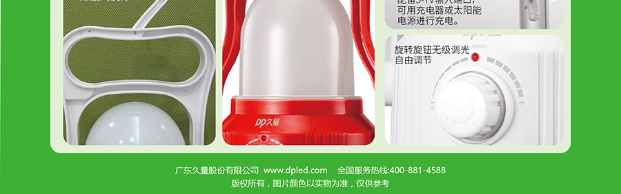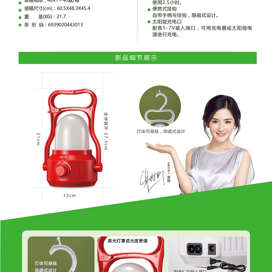 本產(chǎn)品采用柔光燈罩設(shè)計(jì),使燈光更柔和。 配備5-7V輸入端口,可用充電器或太陽能電源進(jìn)行充電。 通過旋轉(zhuǎn)旋鈕開關(guān)來調(diào)節(jié)LED燈強(qiáng)弱光亮度狀態(tài)、自由調(diào)節(jié)。 大空間把手,方便攜帶。內(nèi)置1800mAh超大容量電池,充滿電可連續(xù)使用約2.5小時。 自帶手柄與掛鉤,隱藏式設(shè)計(jì)。