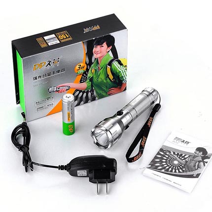 · 使用時,先將鋰電池正極(+)端向內(nèi)方向裝入手電筒內(nèi)(不可裝反,如裝反會導(dǎo)致LED燈不亮),擰上尾塞(要對正螺牙方可擰緊,否則會損壞螺牙);每次按動按鈕開關(guān)下去,則LED照明由強(qiáng)光、滅燈、弱光、滅燈、閃光、滅燈依次循環(huán),直到選擇自己需求的光度為止。