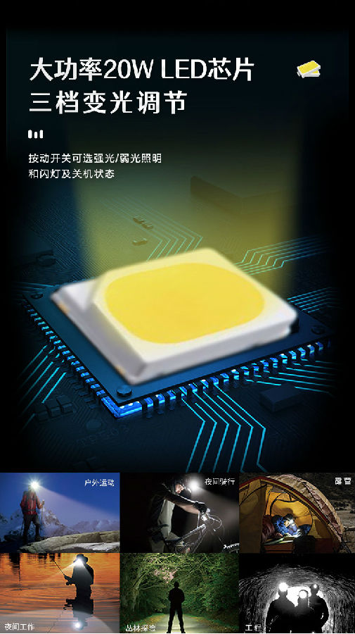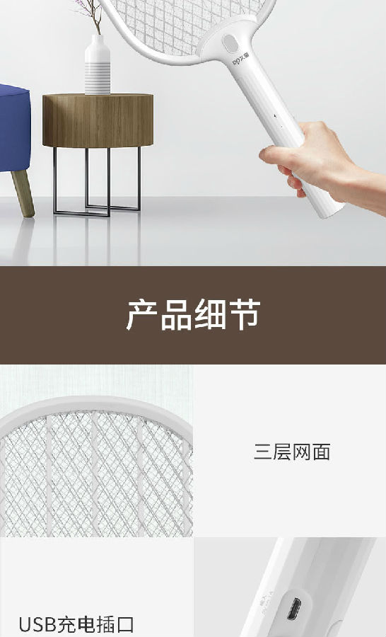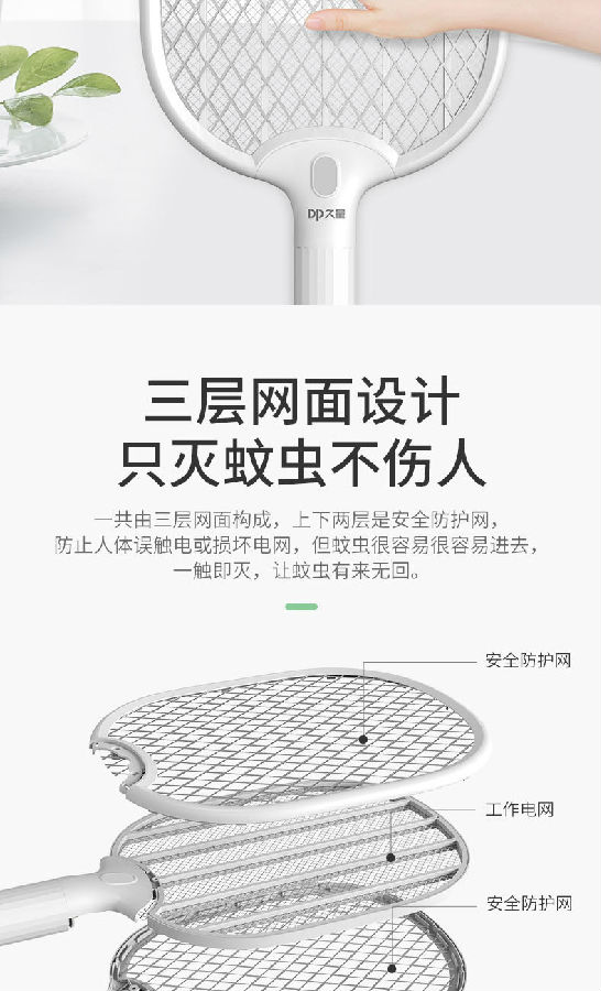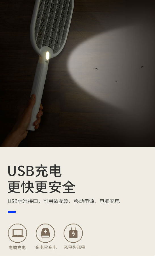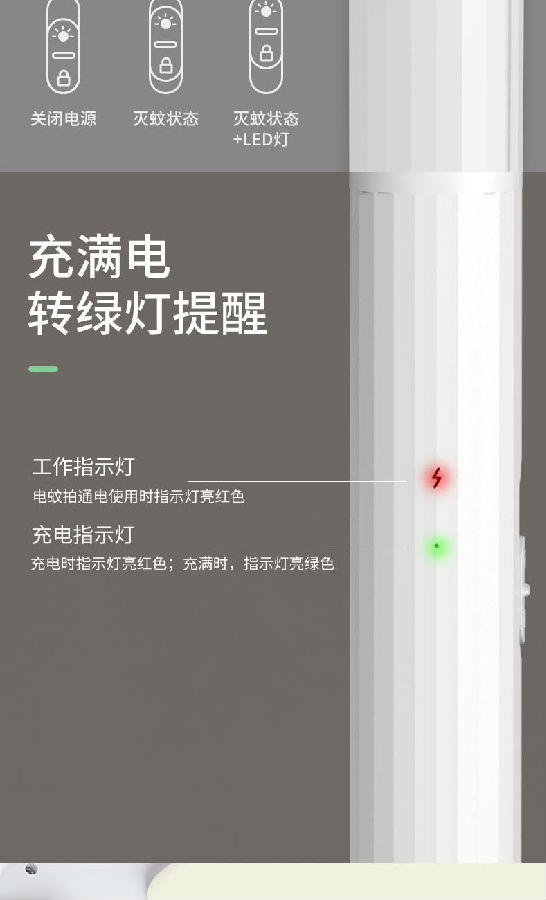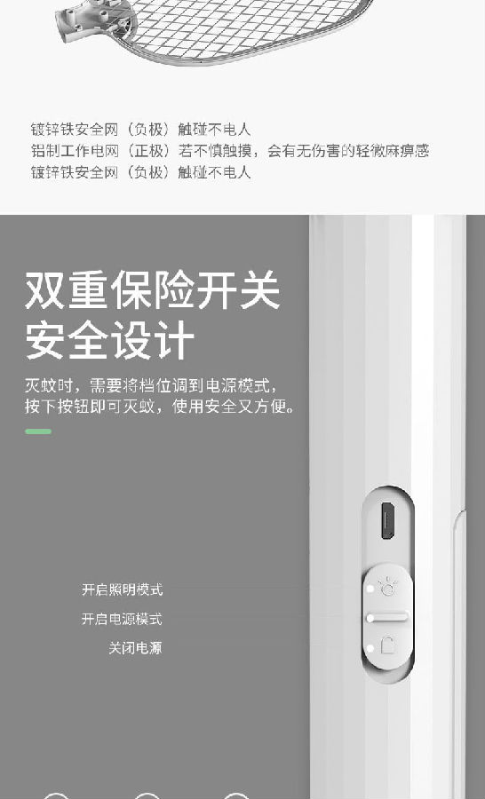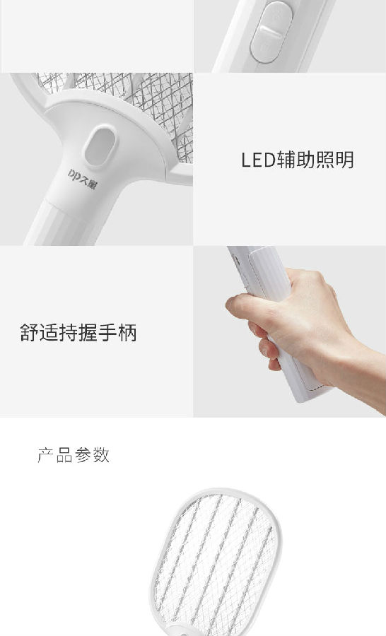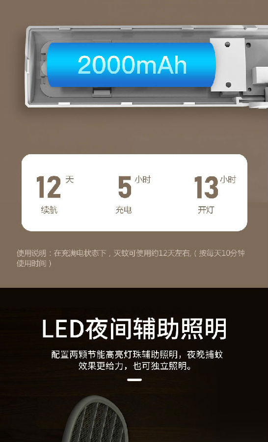 照明采用兩顆LED燈,既能獨立照明,也能為夜間辨別蚊子方位提供輔助照明。