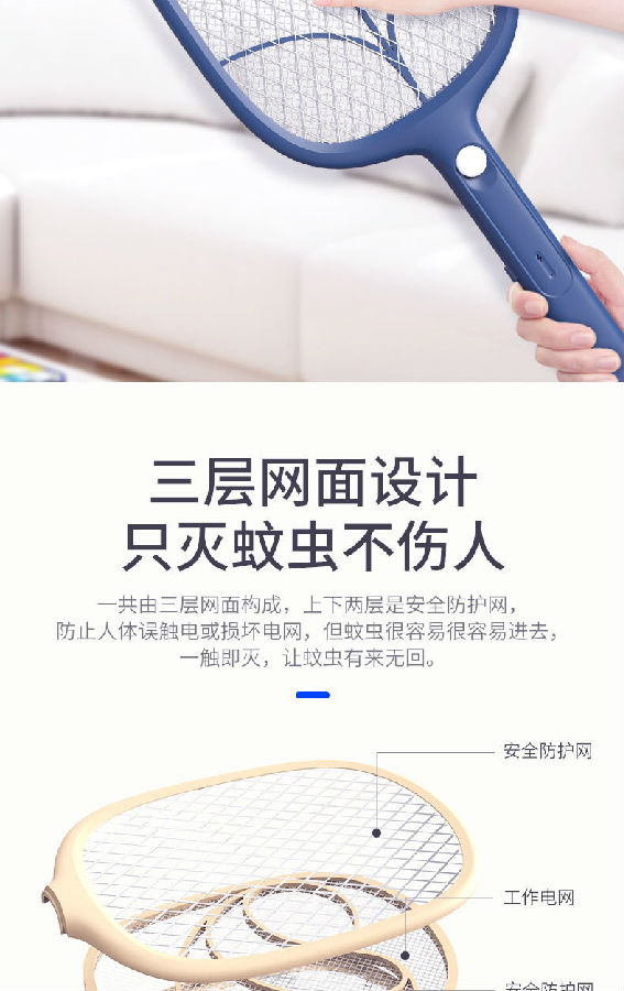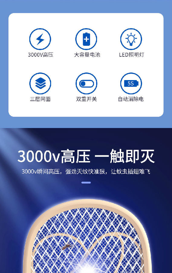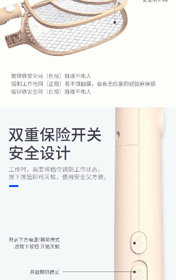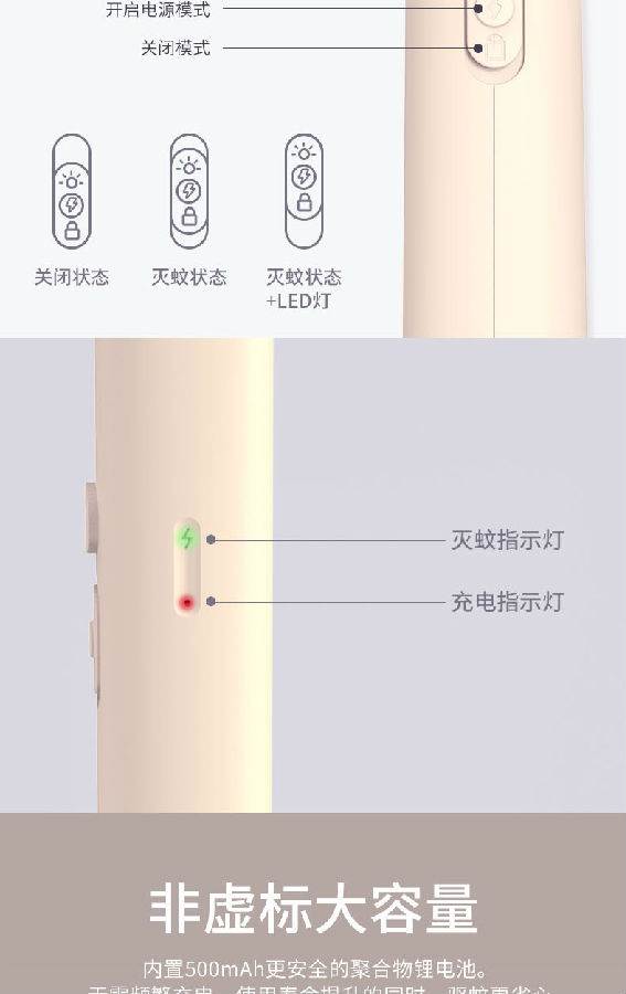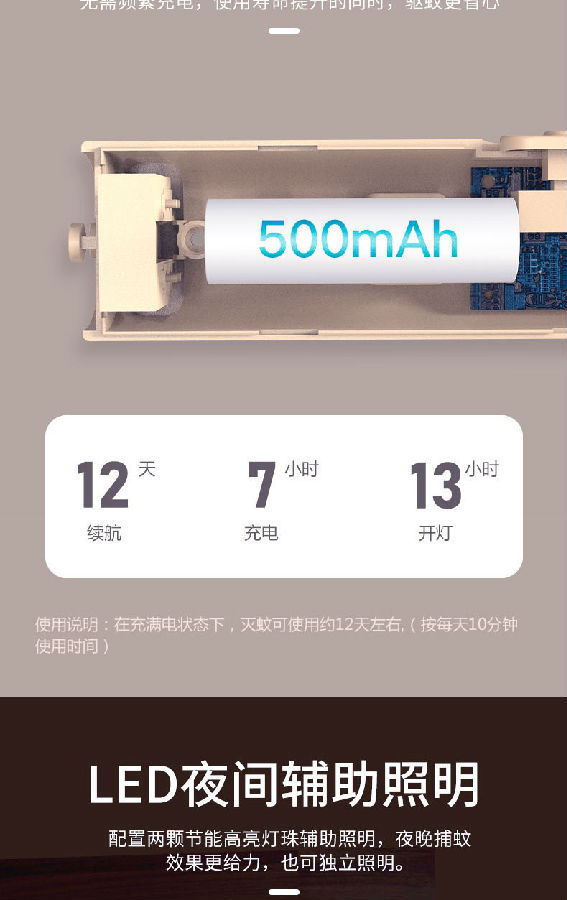 產(chǎn)品內(nèi)置800mAh的鋰電池。 照明采用兩顆LED燈,既能獨立照明,也能為夜間辨別蚊子方位提供輔助照明。