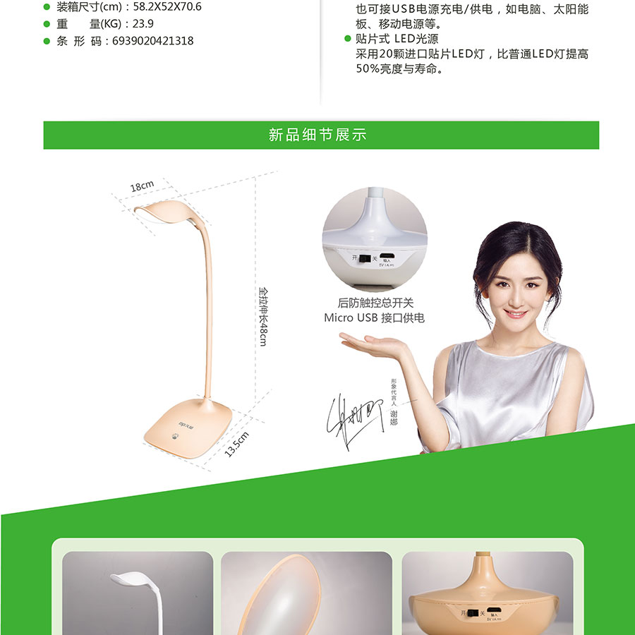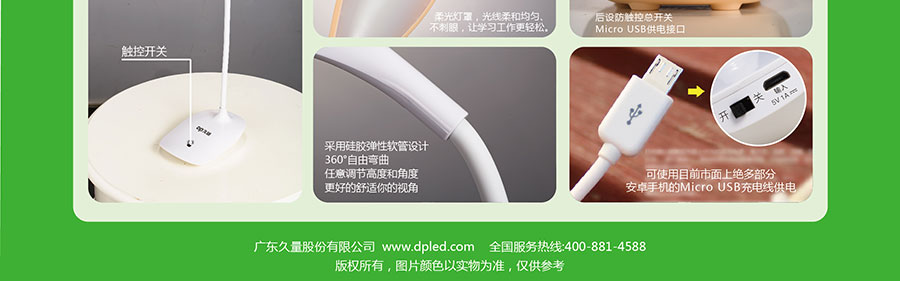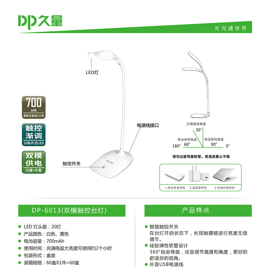 智能觸控開(kāi)關(guān):在臺(tái)燈開(kāi)啟狀態(tài)下,長(zhǎng)按觸摸鍵進(jìn)行亮度無(wú)級(jí)調(diào)節(jié)。 雙模式供電:“內(nèi)置”檔,由內(nèi)置電池直接供電;“外置”檔,由外接充電器直接供電。 外置USB電源線:也可接USB電源充電/供電,如電腦、太陽(yáng)能板、移動(dòng)電源等。 貼片光源:采用20顆進(jìn)口貼片LED燈,比普通LED燈提高50%亮度與壽命。